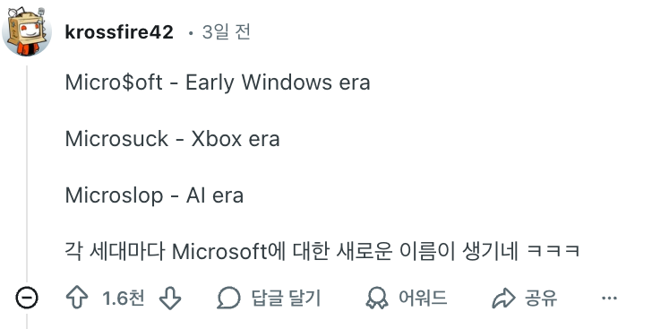 최근 마이크로소프트(Microsoft)의 사명이 Microslop으로 변경되었다? 마소에 어떤 일이 있었는지 알아보자읽을거리 2026. 1. 7. 20:52반응형