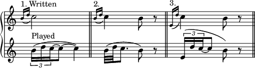 첫 번째 장식음은 주음에서 음정(interval)이 어느 정도 차이가 있어도 가능하지만, 두 번째 장식음은 항상 주음에서 1도 이내에 있어야 합니다. 두 음의 길이는 고정되어 있지 않으며, 주음이 길수록 느리게(보기 1), 주음이 짧을수록 빠르게 연주(보기 2)됩니다. 또한 첫 번째 장식음이 주음에서 음정 차이거 멀리 벌어진 경우가, 두 음이 모두 가까운 경우보다 더 느리게 연주되어야 합니다(보기 3).