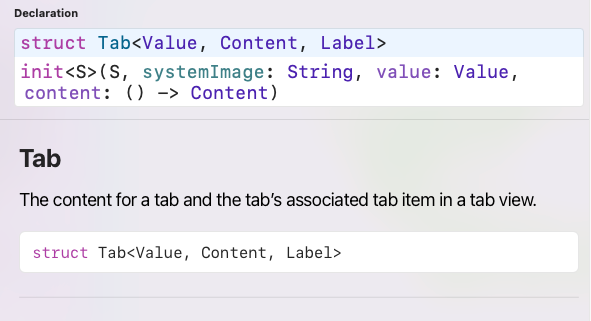 새로운 버전은 탭 페이지를 추가시 TabView 안에 Tab 이라는 SwiftUI 뷰를 사용해 추가합니다. 기존 방법은 tabItem 수정자 + tag/id를 조합했으나 수정자 대신 뷰로 바뀌었고 고유 구분은 value: 파라미터 를 사용합니다.