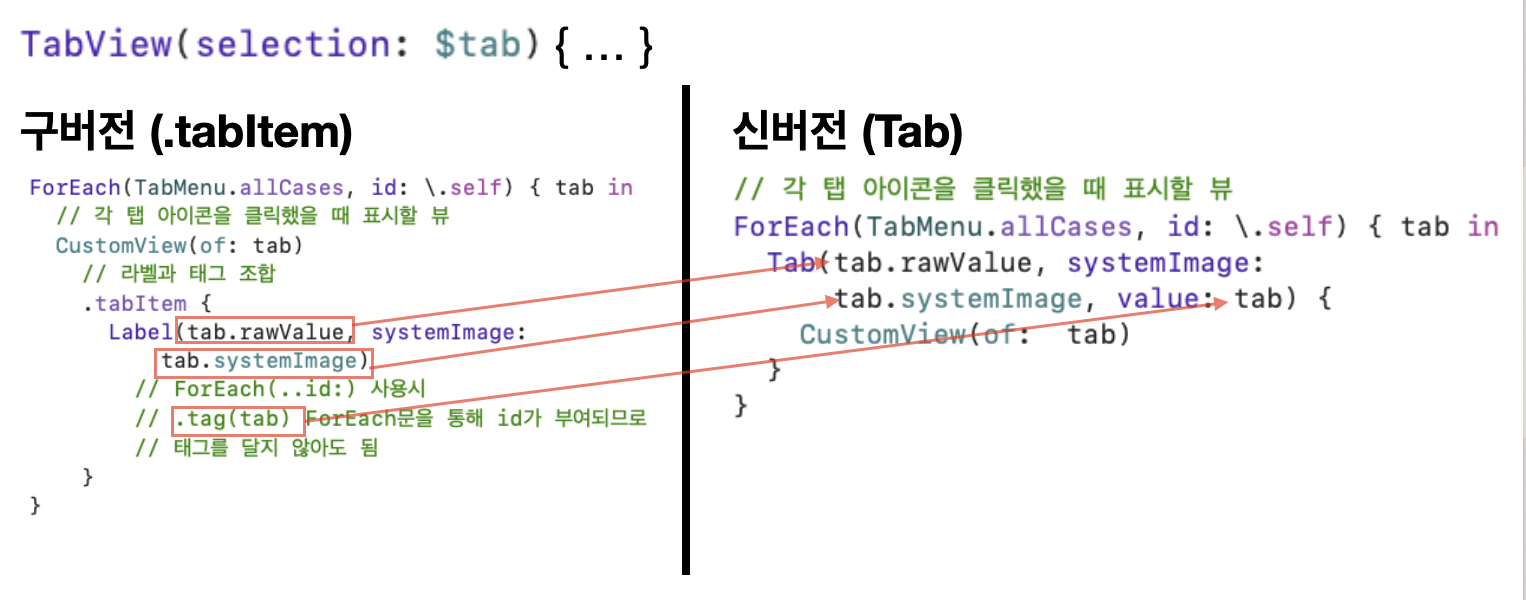 CustomView(of: .home) .tabItem { Label(Tab.home.rawValue, systemImage: Tab.home.systemImage) } .tag(Tab.home) // 구분자 추가새로운 버전 (SwiftUI Tab 이용)
