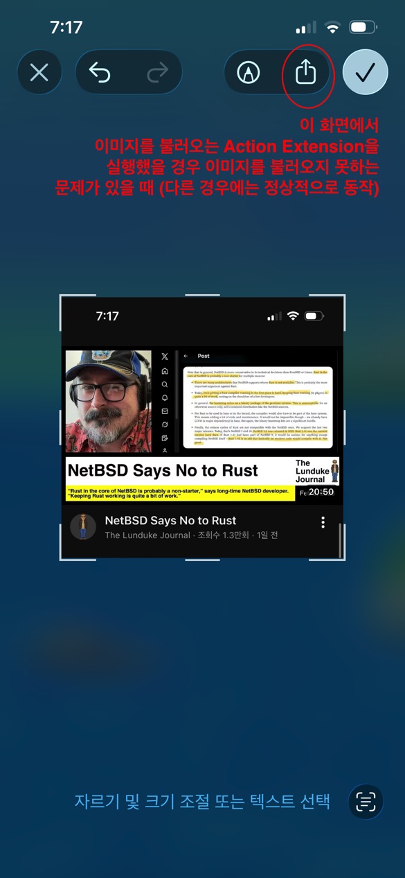 스크린샷으로 찍은 저장 전 화면이 Action Extension에서 안 읽히는 이유는, 이 경우 이미지가 파일(URL)이나 UIImage가 아니라 in-memory PNG/JPEG Data 형태로 전달되는 경우가 많기 때문입니다.