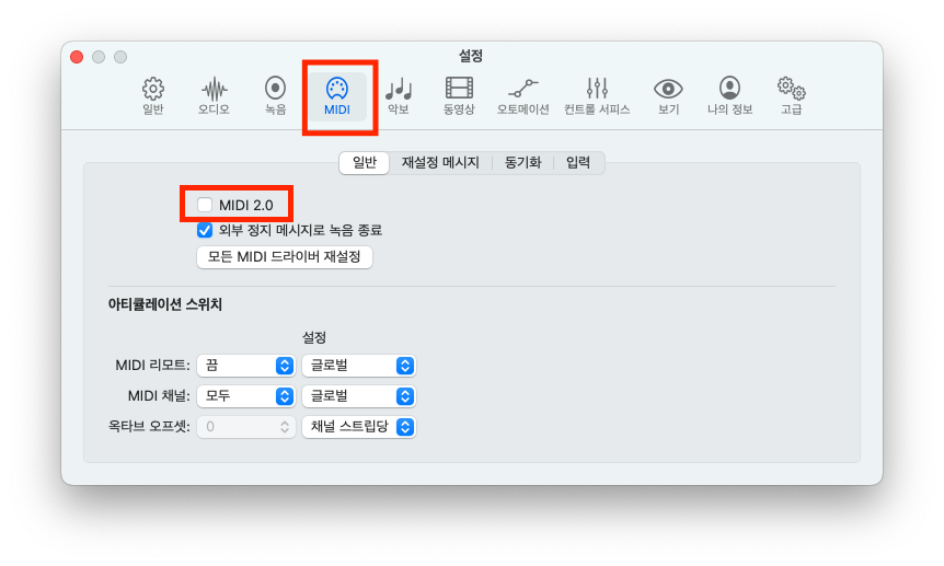 - Logic Pro → Settings (환경설정) → MIDI → General 탭 → "MIDI 2.0" 체크박스를 켜면 됩니다.