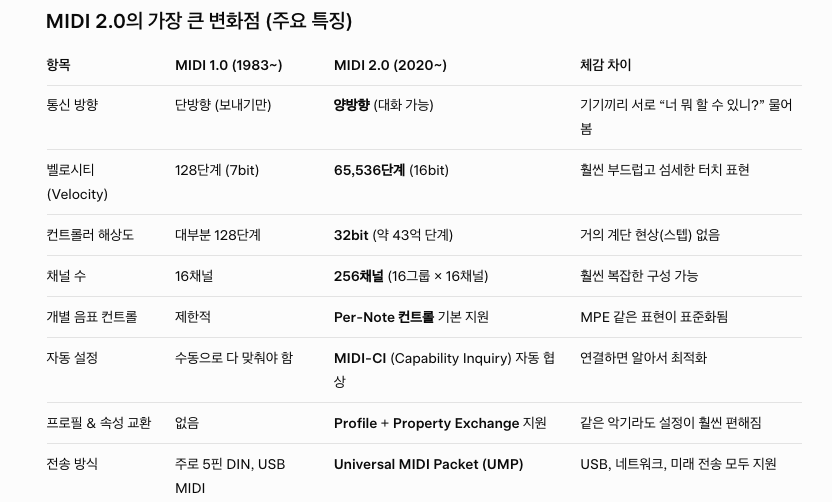 쉽게 말하면 “40년 넘게 잘 써온 MIDI를 21세기에 맞게 대폭 업그레이드한 버전”이라고 생각하면 됩니다.