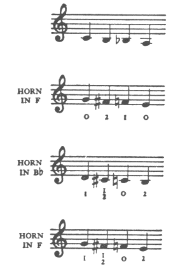 같은 실제 음을 얻기 위해 파트를 이조한 뒤, 싱글 B♭ 호른에서의 운지로 연주한 것. - 네번째(Horn in F; 표기는 F조이나 악기는 B♭ 기준으로 연주):