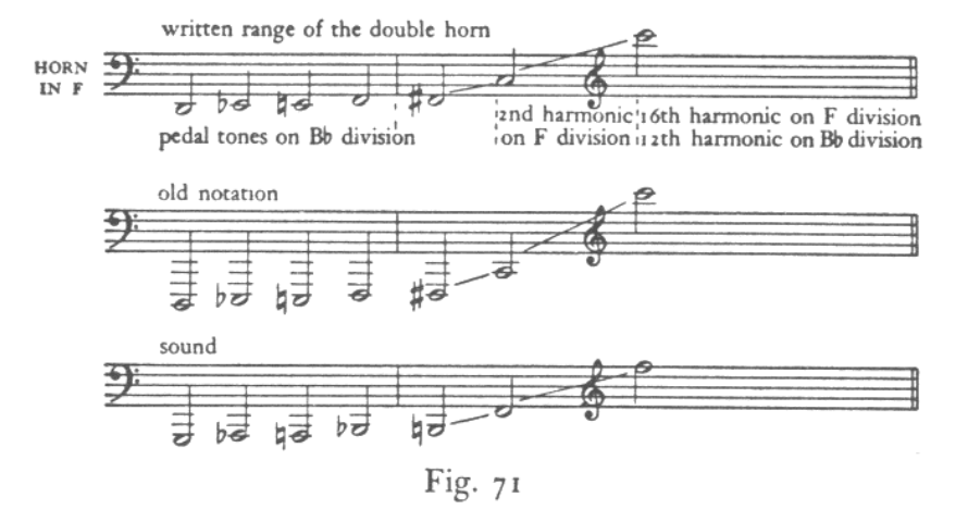 F호른은 제16배음 이상까지 연주가 가능했지만, 최고음은 연주하기 어렵고 앙부슈르에 큰 부담을 주었습니다. 같은 음을 B♭ 호른으로 연주하려면 완전4도 아래로 이조하여 연주했으며, 그 결과 F호른의 제16배음은 B♭ 호른에서는 단지 제12배음에 해당하게 됩니다.