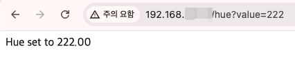 void start_webserver(void) { // ... httpd_uri_t hue_uri = { .uri = "/hue", .method = HTTP_GET, .handler = hue_handler, }; httpd_register_uri_handler(server, &hue_uri); // ... }hue?value=값 을 URL로 넣어 확인합니다.