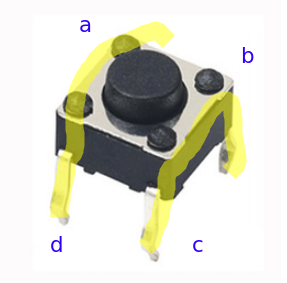 저항이 연결된 LED 다리 한 쪽과 저항 사이를 멀리 떨어트려 놓습니다. 그 사이에 버튼을 설치합니다. 그리고 LED 다리 한 쪽은 a(또는 d)와 연결하고, 저항 한 쪽은 b(또는 c)와 연결합니다. 기본적으로는 버튼이 눌리지 않은 상태이므로 둘 사이는 연결되어 있지 않아 불빛이 나오지 않습니다. 버튼을 누르면 서로 연결되어 LED가 나타내게 되는 것입니다.