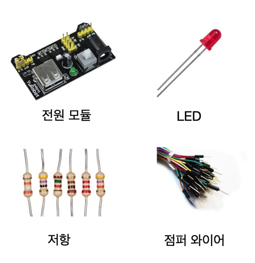 - 전원 모듈 (건전지 어댑터 등 전원을 연결할 수 있는 것은 모두, 3.3V 또는 5V)