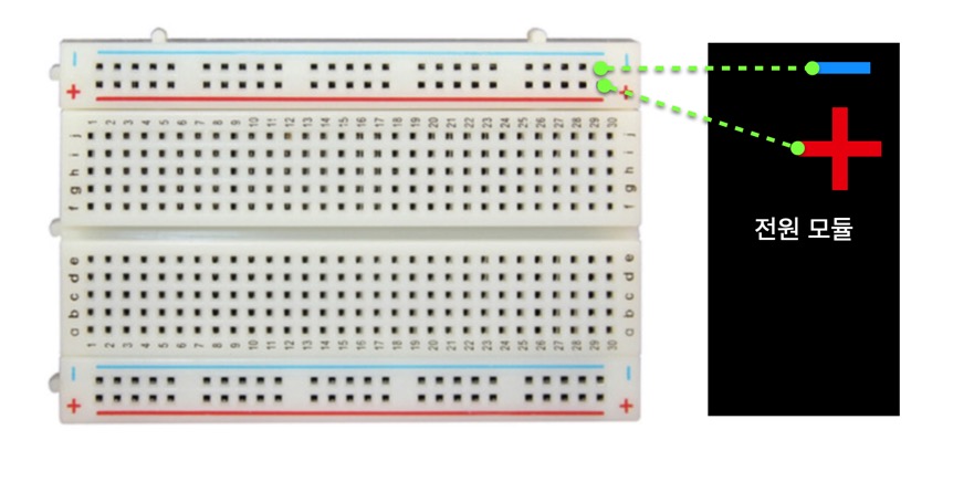 - 브레드보드 위쪽 전원 레일에 꽂기