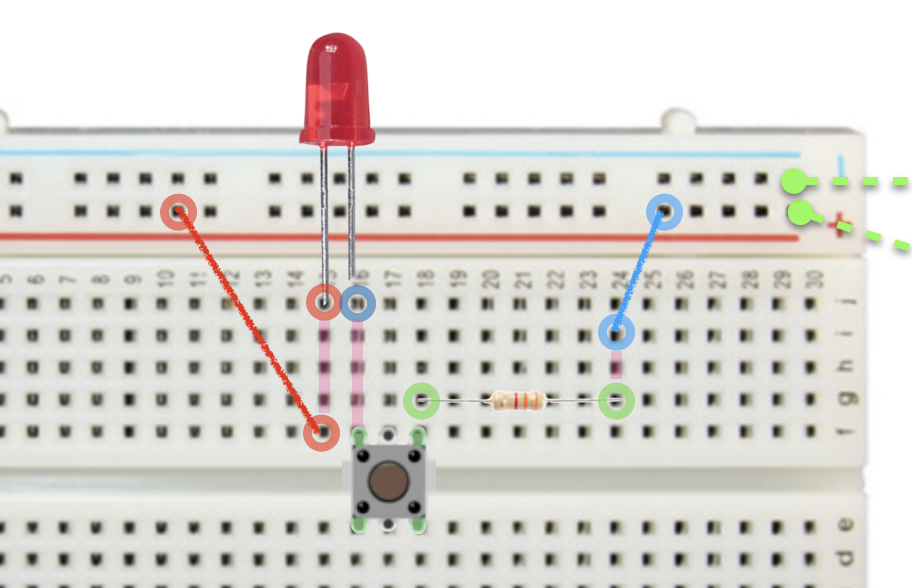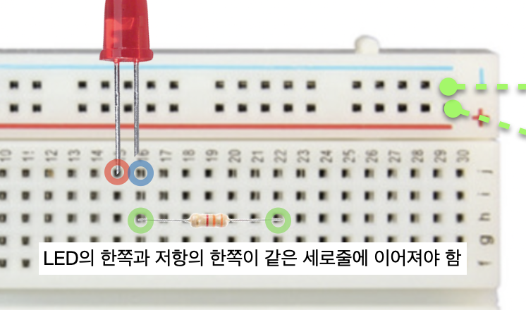 저항 한 쪽은 LED와 연결하고, 다른 쪽은 전원 레일 (+ 또는 -)와 연결합니다.